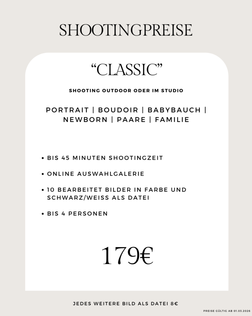 Bei dem Preispaket „Classic“ erhältst du nach dem Shooting eine Onlinegalerie mit den entstandenen Bildern, dort wählst du dann deine Favoritenbilder aus, diese werden dann hochwertig retuschiert und bearbeitet. Nach ca. 6-10 Werktagen erhältst du die fertigen Bilder zum Downloaden.