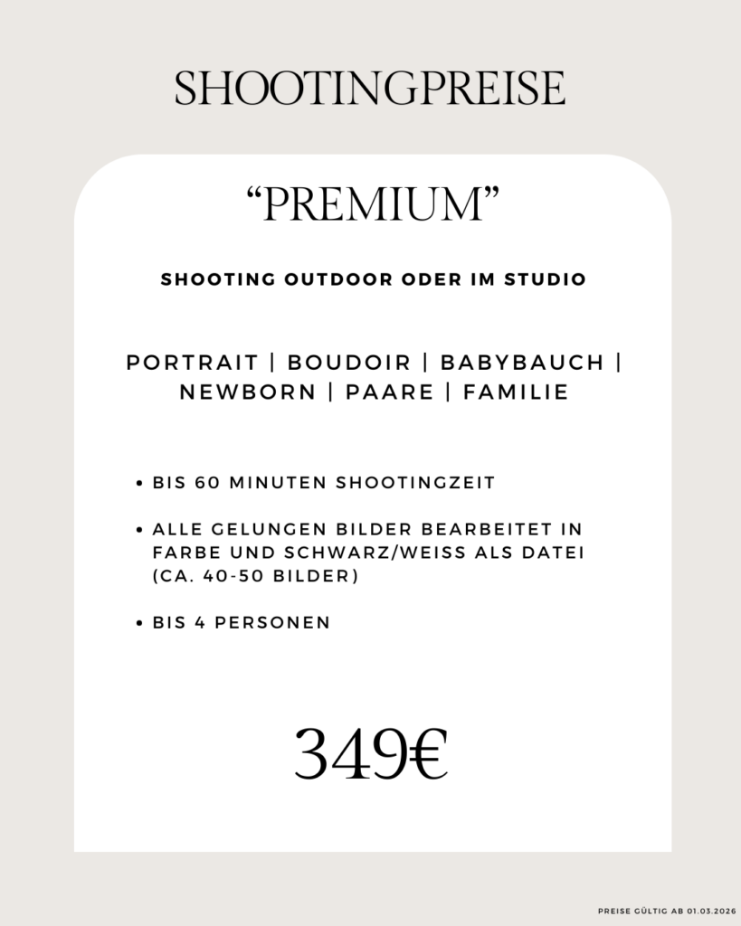 Bei dem Preispaket „Premium“ wähle ich deine schönsten Bilder aus (40-50 Stück) diese werden dann hochwertig retuschiert und bearbeitet. Nach ca. 10-14 Werktagen erhältst du die fertigen Bilder zum Downloaden, zusätzlich bekommst du 10 Bilder noch als Print in den Maßen 10×15 zugeschickt.